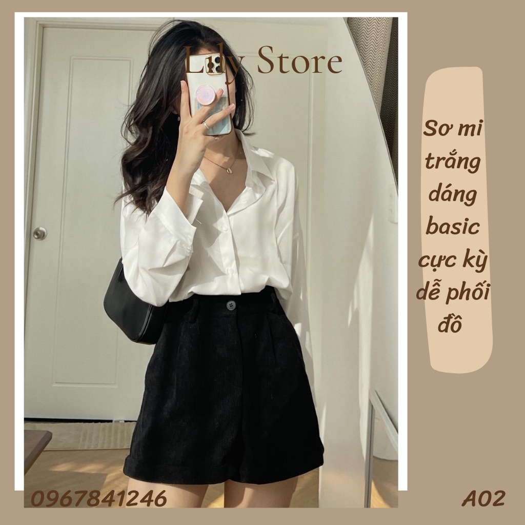 Áo sơ mi trắng nữ form rộng tay dài, áo sơ mi đi học công sở tay dài basic dễ phối đồ màu trắng A02 LILY