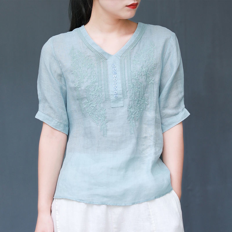 Áo Sơ Mi Vải Lanh Cotton Mỏng Cổ V Dáng Rộng Thêu Họa Tiết Kiểu Retro Thời Trang Cho Nữ