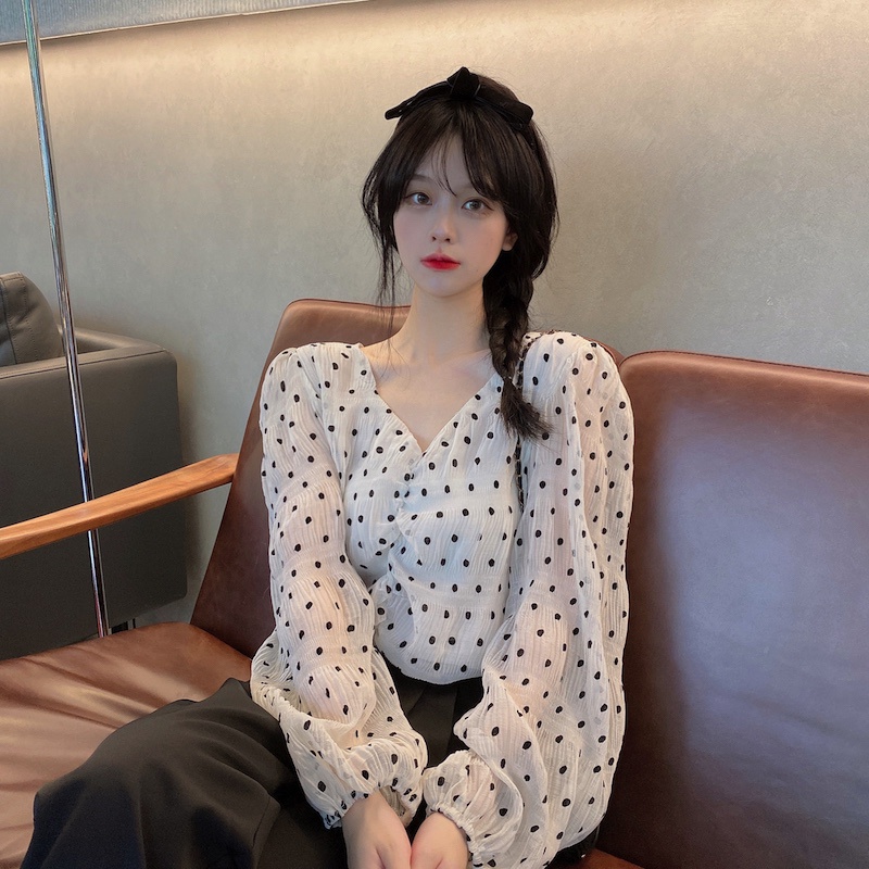 Áo Sơ Mi Voan Cổ Tim Họa Tiết Chấm Bi Xinh Xắn Dành Cho Nữ