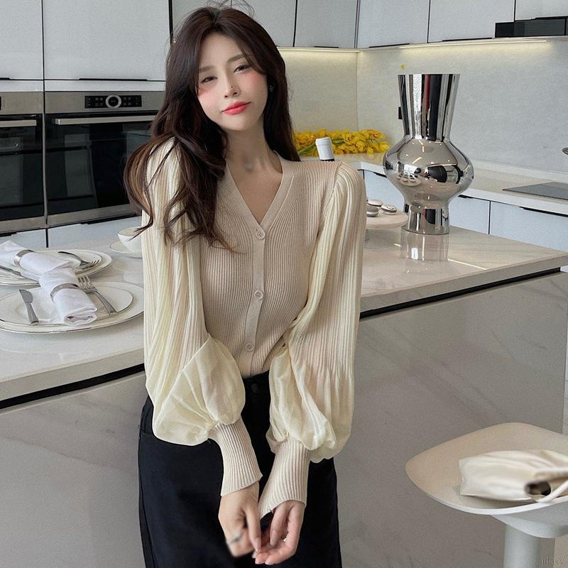 Áo sơ mi voan tay dài cổ chữ V phong cách Hàn Quốc retro ngọt ngào cho nữ