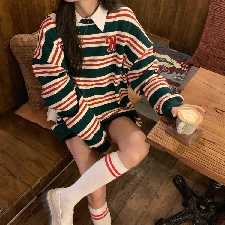 Áo sweater cổ tròn dài tay dáng rộng kẻ sọc dày dặn phong cách mới thời trang thu đông 2021 cho nữ