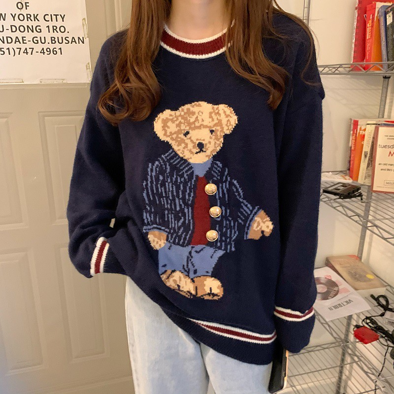 Áo sweater cổ tròn tay dài in hình hoạt hình xinh xắn dễ phối đồ phong cách Hàn Quốc cho nữ
