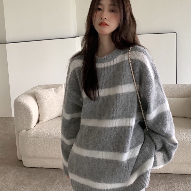 Áo sweater Dệt Kim Cổ Tròn Kẻ Sọc Màu Sắc Phong Cách Nhật Bản Thời Trang Thu Đông Cho Nữ