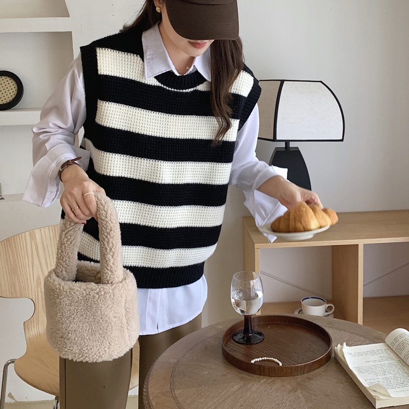 Áo sweater SUXI dệt kim sát nách dáng rộng cổ chữ V kẻ sọc thời trang mùa thu cho nữ