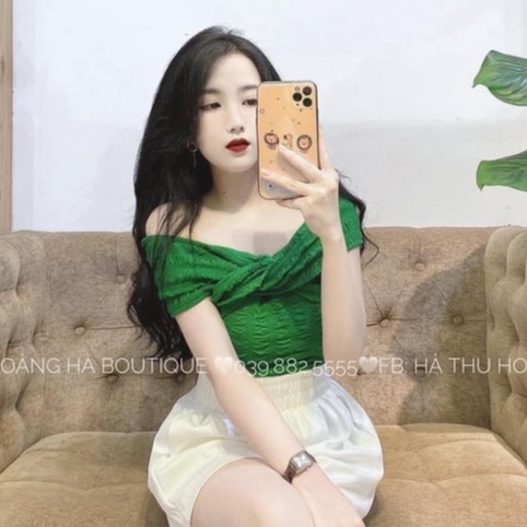 Áo thun cộc tay xốp trễ vai xoắn chéo ngực siêu sang chảnh