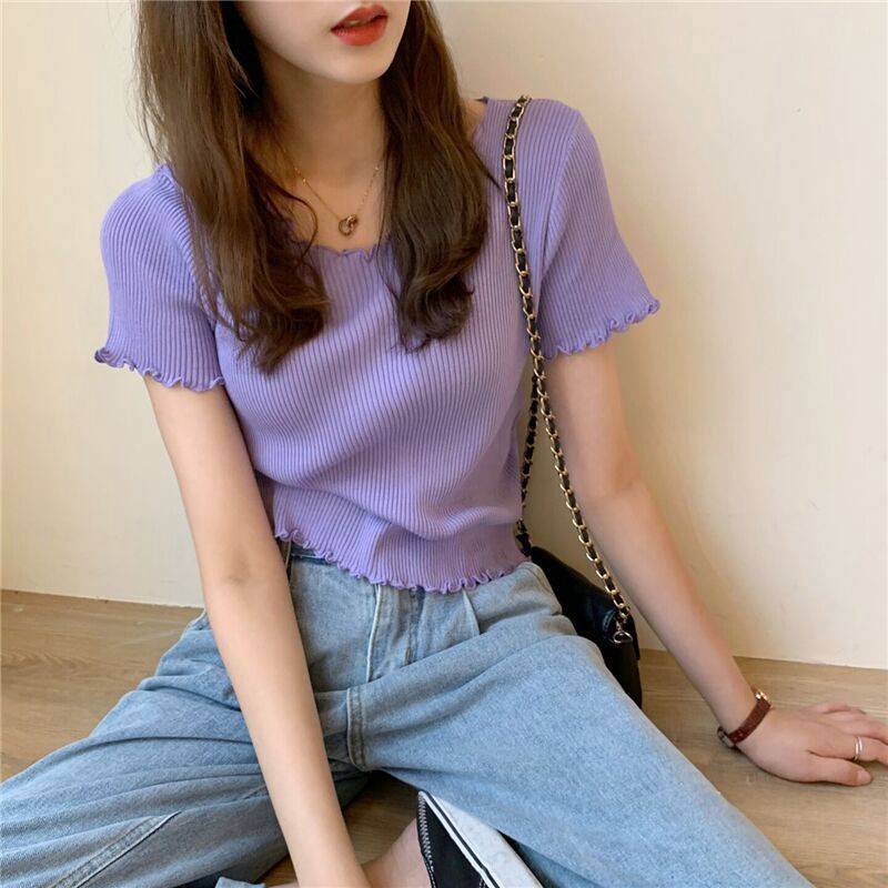 Áo thun dệt kim lụa băng tay ngắn vừa vặn viền nhún bèo thời trang cho nữ