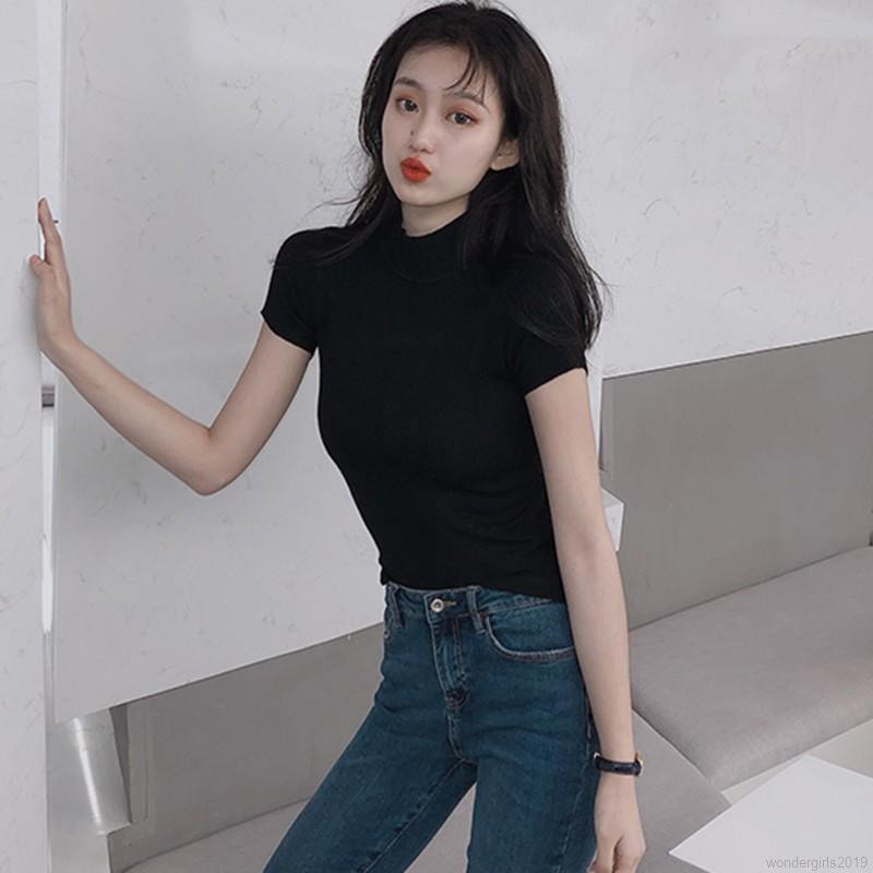 Áo thun dệt kim tay ngắn cổ lọ màu trơn thiết kế trẻ trung thời trang cho nữ