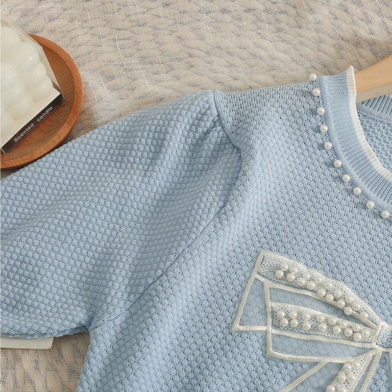 Áo Thun Dệt Kim Tay Ngắn Cổ Tròn Thắt Nơ Đính Hạt Phong Cách Hàn Quốc Cho Nữ tao bao