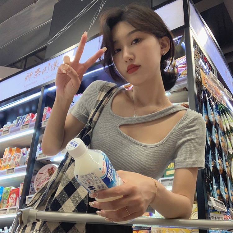 Áo Thun Dệt Kim Tay Ngắn Dáng Ôm Thiết Kế Độc Đáo Phong Cách Hàn Quốc Cho Nữ