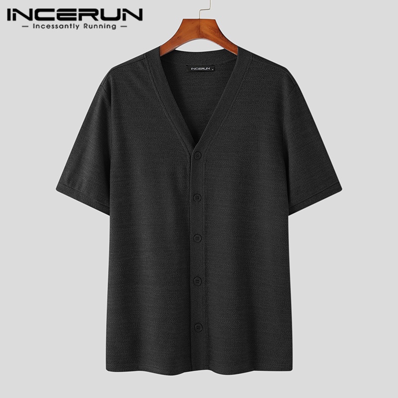 Áo thun dệt kim INCERUN ngắn tay cổ chữ V phối nút phong cách thời trang cho nam