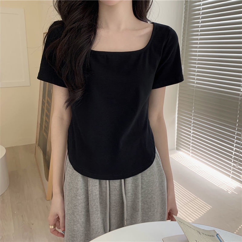 Áo thun nữ BH tay ngắn cổ vuông màu sắc thanh lịch