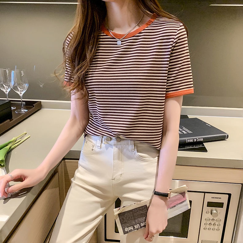 Áo Thun Nữ Ngắn Tay Cổ Tròn Sọc Ngang Phong Cách Châu Âu Mới