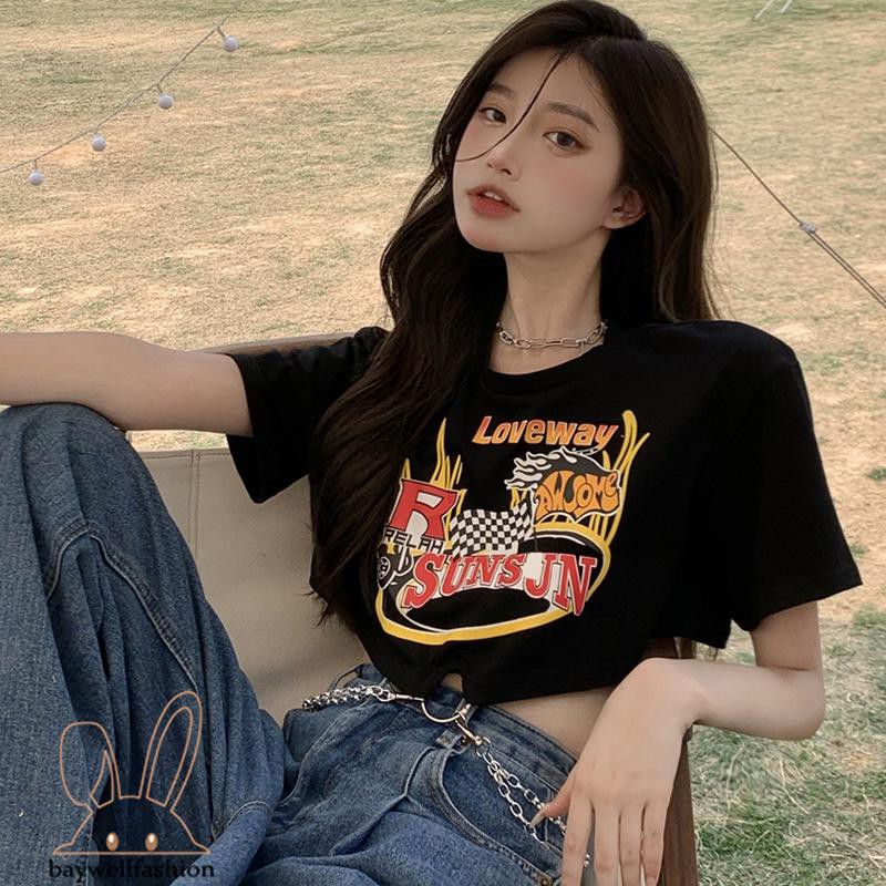 Áo Thun Ngắn Tay Dáng Rộng Hở Bụng Phối Dây Xích Cá Tính Dành Cho Nữ