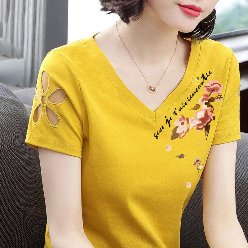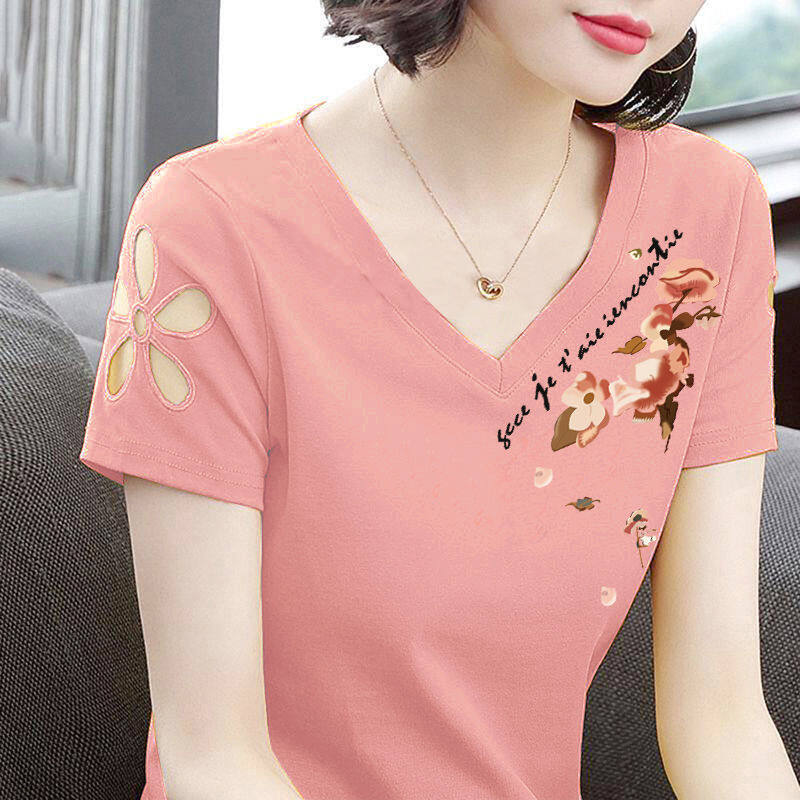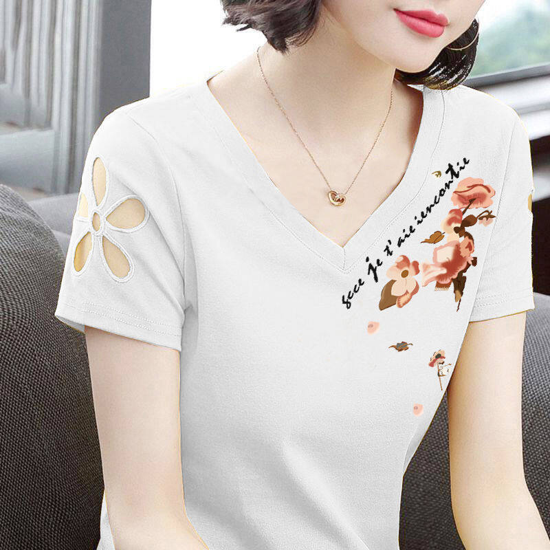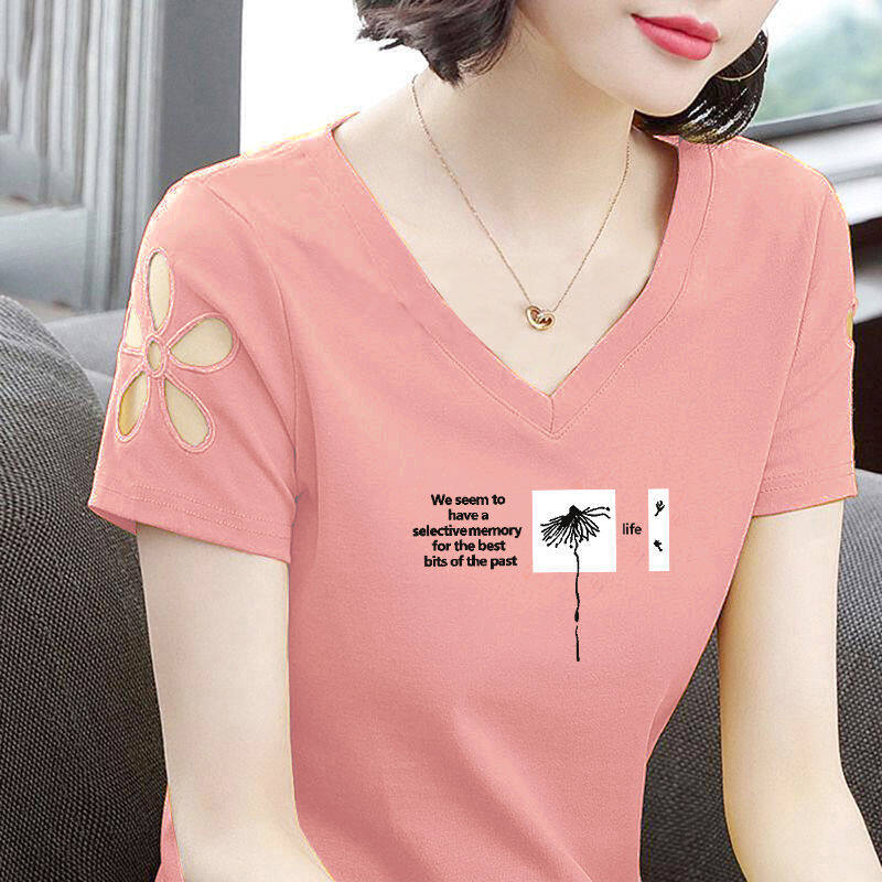 Áo Thun Ngắn Tay Nữ Mới Mùa Hè Slim Plus Size Hollow V-cổ Phiên Bản Hàn Quốc Joker