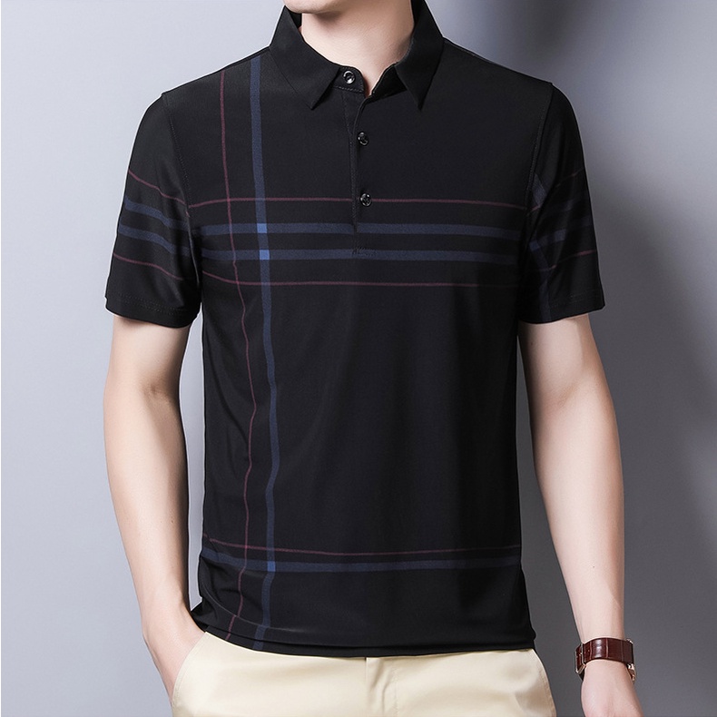 Áo Thun polo Tay Ngắn Dáng Ôm Vải Lụa Lạnh Mỏng Nhanh Khô In Họa Tiết Caro Kiểu Hàn Quốc Thời Trang Cho Nam