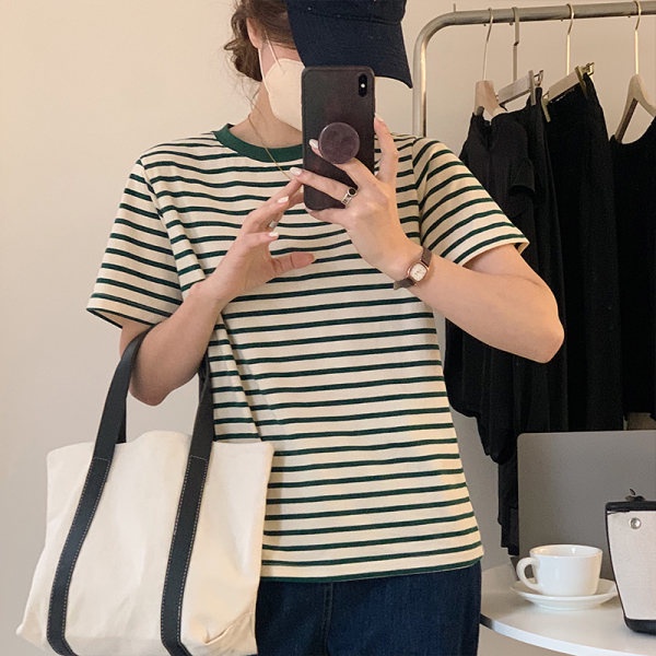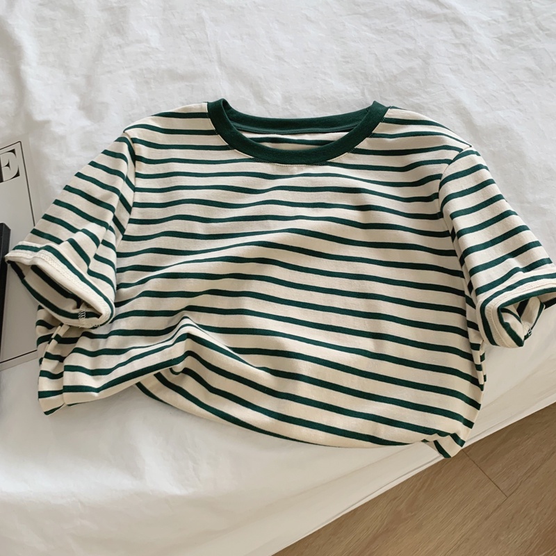 Áo thun SUXI tay ngắn cổ tròn dáng suông họa tiết kẻ sọc đơn giản thời trang mùa hè dành cho nữ