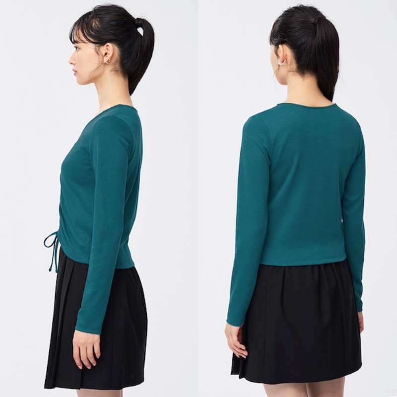 Áo thun tăm nữ dài tay cổ tim rút dây phía trước xinh xắn của GU - Nhật Bản