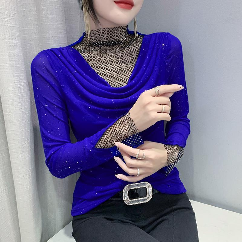 Áo Thun Tay Dài Cổ Cao Phối Lưới Rỗng Đính Kim Cương Thu Đông Phong Cách Mới @