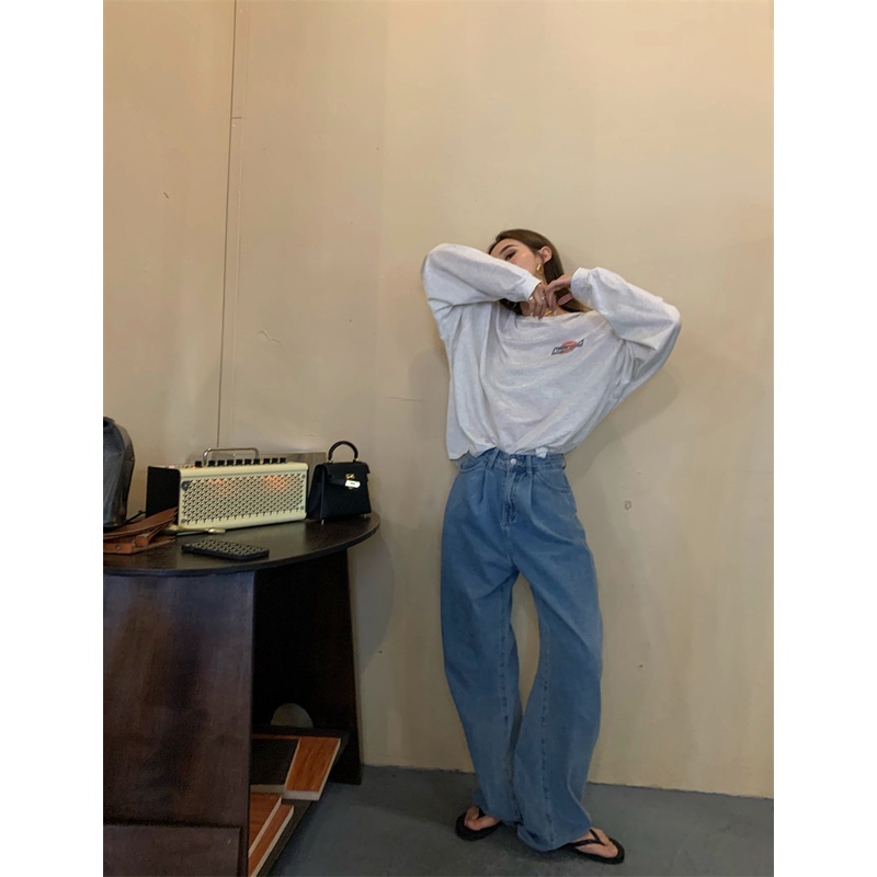Áo thun tay dài cổ tròn dáng rộng in chữ kiểu Hàn với 2 màu bắt mắt tùy chọn dành cho nữ