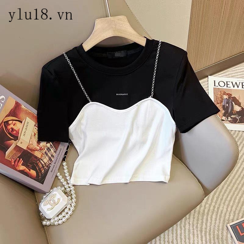 Áo Thun Tay Ngắn Cổ Tròn Giả Hai Lớp Phối Dây Xích Màu Sắc Tương Phản Phong Cách Hàn Quốc Thời Trang Mùa Hè Cho Nữ