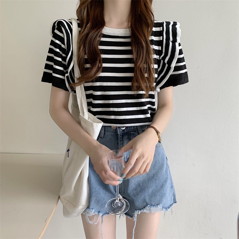Áo Thun Tay Ngắn Cổ Tròn Họa Tiết Kẻ Sọc Thời Trang Hàn Quốc Dễ Thương Cho Nữ