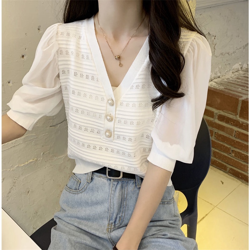 Áo Thun Tay Phồng Cổ Chữ V Phối Ren Và Nút Ngọc Trai Ngọt Ngào Cá Tính Thời Trang Xuân Hè Cho Nữ
