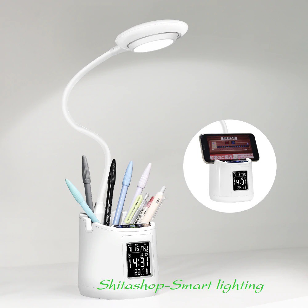 Đèn bàn đọc sách pin sạc đa chức năng Sử dụng chip led cao cấp cho ánh sáng không nhấp nháy và không chói, có lợi cho mắt, không mỏi mắt khi dùng đèn thời gian dài . Đèn có thể chuyển đổi 3 loại ánh sáng Trắng sáng, Trắng tự nhiên và Vàng và mỗi loại ánh sáng có 3 mức chỉnh độ sáng Thấp, Trung Bình , Cao để bạn có thể lựa chọn phù hợp với nhu cầu sử dụng . Đèn có tích hợp pin sạc nên bạn vẫn có thể sử dụng đèn hơn 2 giờ khi cúp điện Là sự lựa chọn tốt nhất khi bạn cần chọn đèn đọc sách cho bạn , đèn học bài cho con em mình. Ngoài ra thân đèn có đồng hồ thông minh tiện lợi, thú vị. Thân đèn có hộc đựng bút , viết hoặc giá đỡ điện thoại khi cần . *** Ánh sáng đèn có thể chuyển từ Trắng - Trắng tự nhiên và Vàng *** Công suất 5W-8W *** Điện áp : 5V-2A - Đi kèm adapter và dây USB sạc ++++ Bộ sản phẩm đầy đủ bào gồm Đèn , adapter 5V , dây sạc .