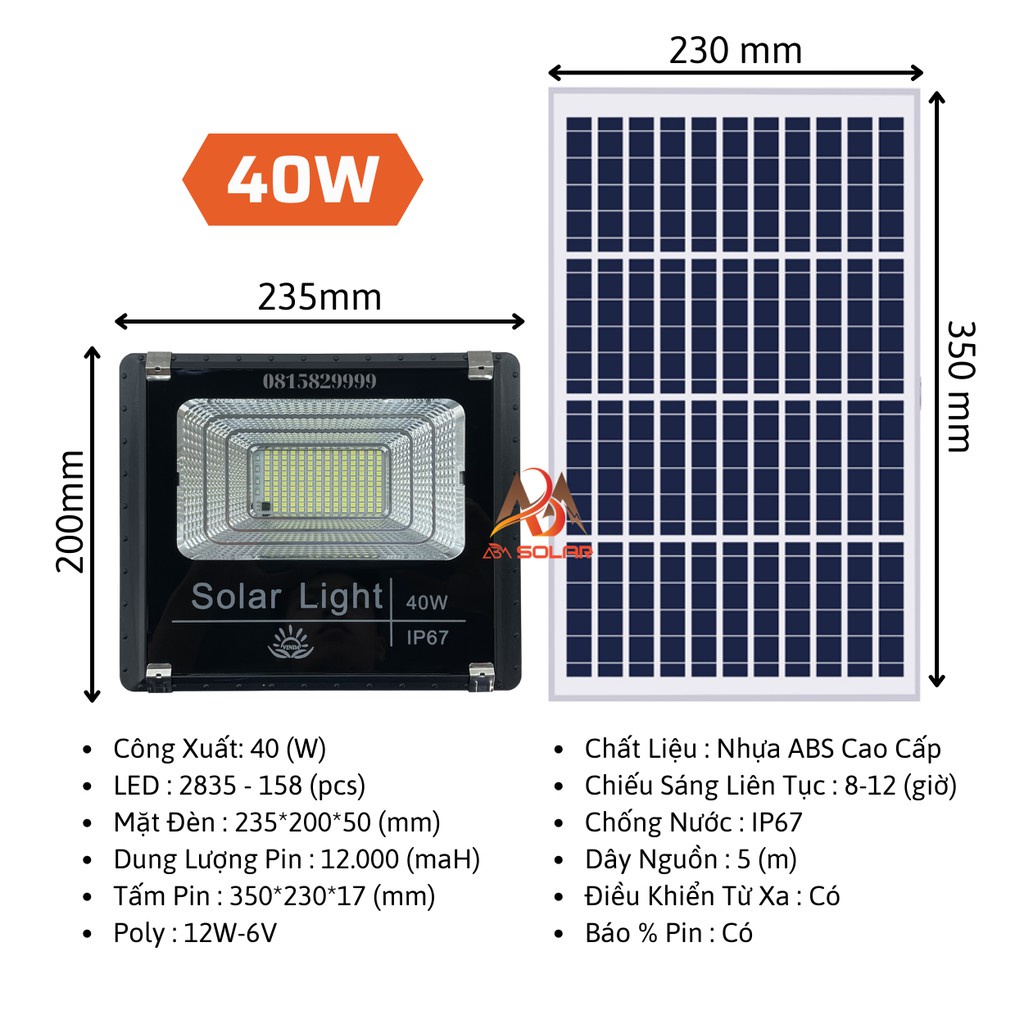 Đèn Năng Lượng Mặt Trời 40W, Đèn Pha LED, Tấm Pin Rời, Chống Nước , Kính Cường Lực Solar Light VinDa - ABM Solar