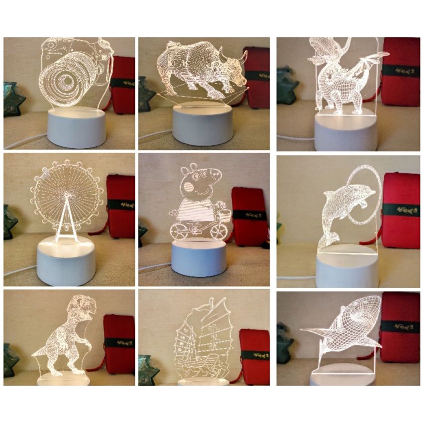 Đèn ngủ để bàn họa tiết 3D, đèn trang trí phòng ngủ Thông tin sản phẩm : - 1 bộ đèn gồm 1 đế đèn và 1 hình mica khắc laser - Kích thước đế: 5cm x 10cm - Kích thước hình: cao 15cm -20 cm tùy mẫu - Được thiết kế và khắc laser tinh xảo trên tấm Mica cao cấp - Sản phẩm được thiết kế với hình ảnh độc đáo, lạ mắt - Màu sắc đơn giản nhưng không kém phần thu hút sẽ là món quà tặng vô cùng ý nghĩa cho người thân yêu trong phòng ngủ. - Ánh sáng của đèn được phát ra dễ chịu, phù hợp với không gian phòng ngủ.