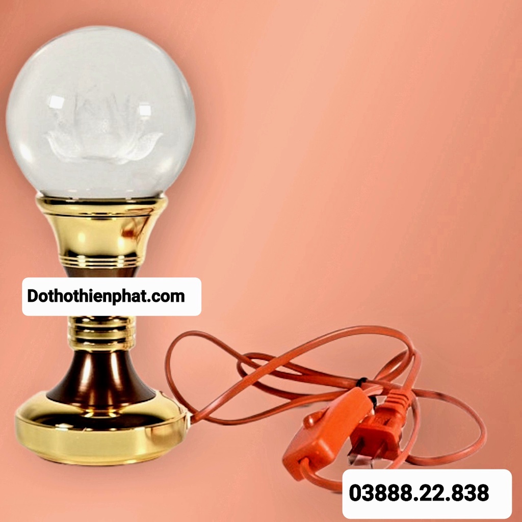 Đèn thờ led pha lê quả cầu sen nguyên khối đế đồng vàng đổi màu cao cấp – 8in cao 20 cm