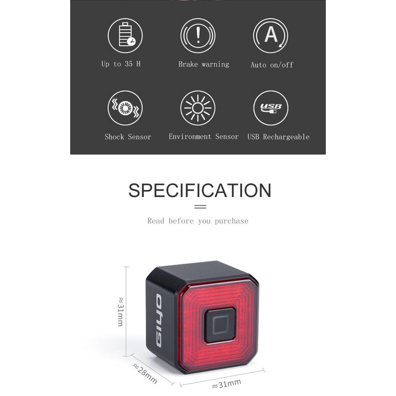 Đèn sau xe đạp phanh tự động bật / tắt thông minh Bởi GIYO Sự chỉ rõ * Kiểu: Đèn hậu xe đạp có độ sáng cao * Nguồn điện: USB & Pin Li-on 350 mAH * Màu sáng: Đỏ * Sạc: Khoảng 2,2 giờ để sạc đầy, kéo dài trong 10-35 giờ * Trọng lượng tịnh: ≈26 g * Chế độ ánh sáng: Kh