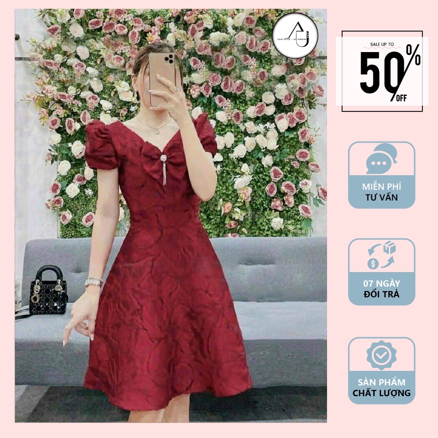 Đầm Gấm Dự Tiệc Tay Phồng Cổ Vuông AU.DESIGN Hoa Nhún Cúp Ngực Sang Chảnh Màu Đỏ Freesize