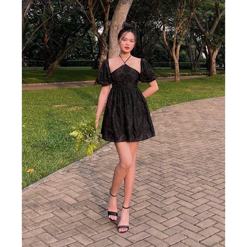 Đầm Đen Gấm Hoa Nổi 💖DEMISS💖 Váy Đen Dây Yếm Đan Lưng Cực Sang Chảnh - V-Đen-78