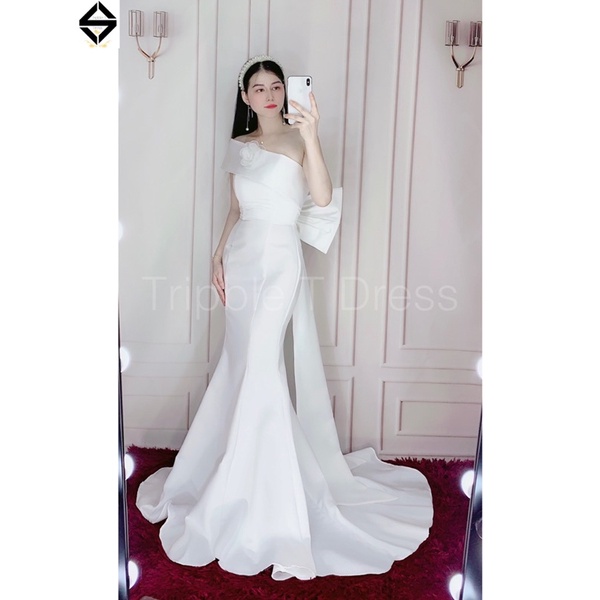 Đầm váy cô dâu đi bàn, dạ hội đuôi cá ôm body khoét lưng đính kèm nơ xòe to sang trọng