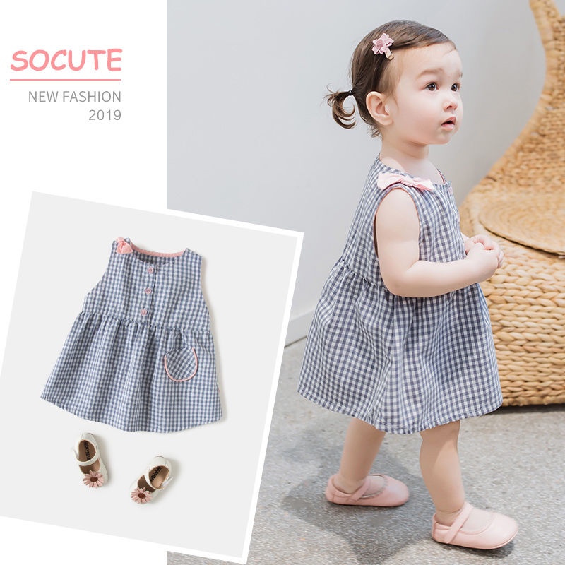 Đầm công chúa Bear Leader eo cao kẻ sọc caro đính nơ ngọt ngào cho bé gái