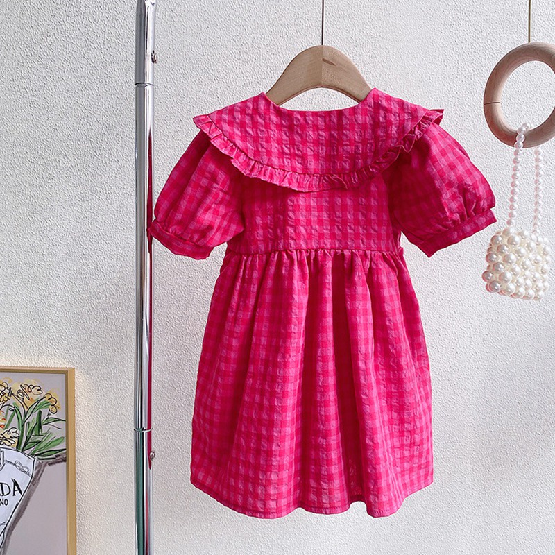 Đầm Công Chúa Mùa Hè Tay Cộc Cổ Búp Bê In Họa Tiết Kẻ Sọc Caro Phong Cách Hàn Quốc Cho Bé