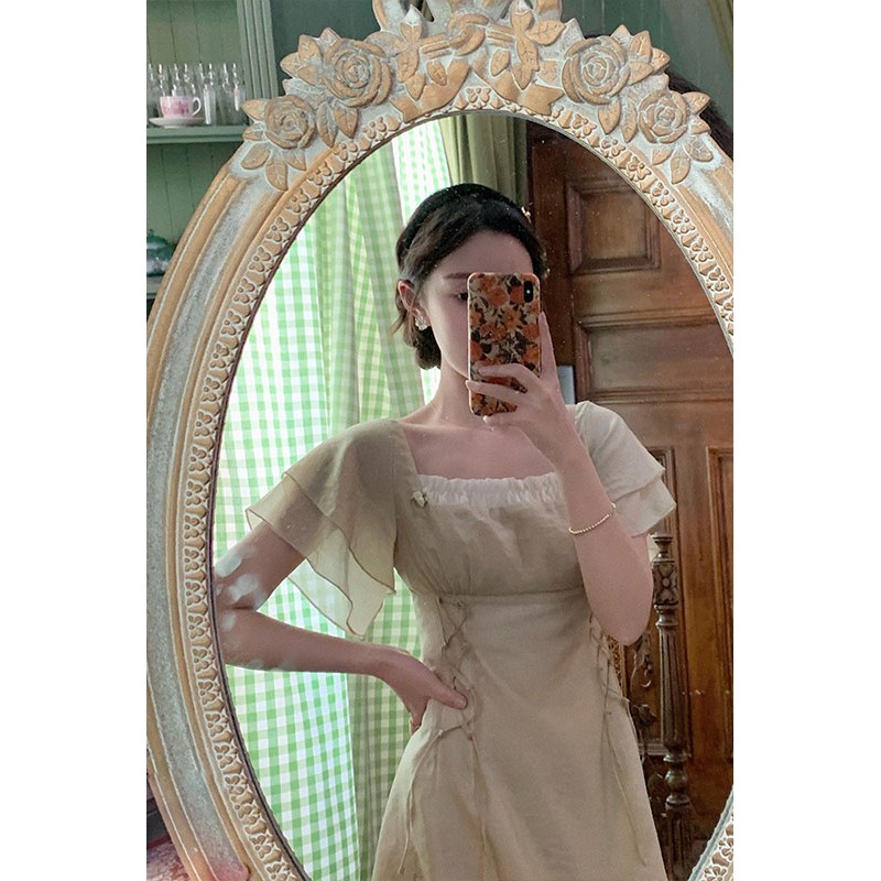 Đầm cổ tích màu xanh ngọc cổ vuông tay loe eo đan dây váy thiết kế tiểu thư dáng dài