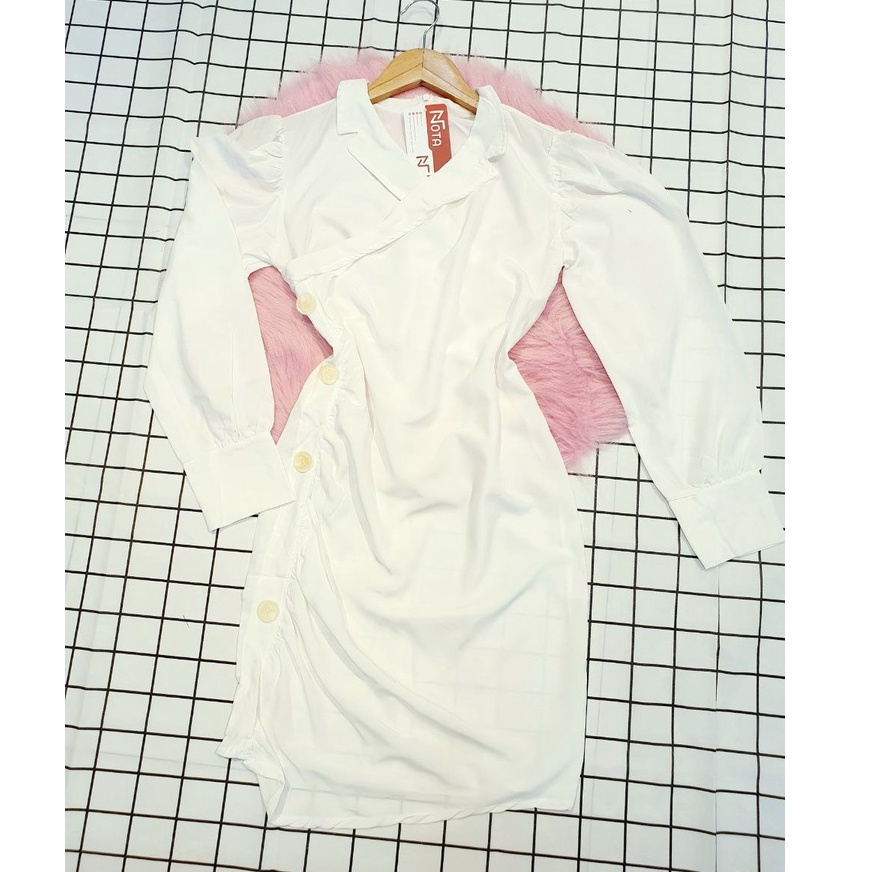 Đầm cổ vest chéo, Đầm dự tiệc dạo phố cổ vest tay dài xinh xắn, ĐẦM 6 NÚT SƯỜN EO