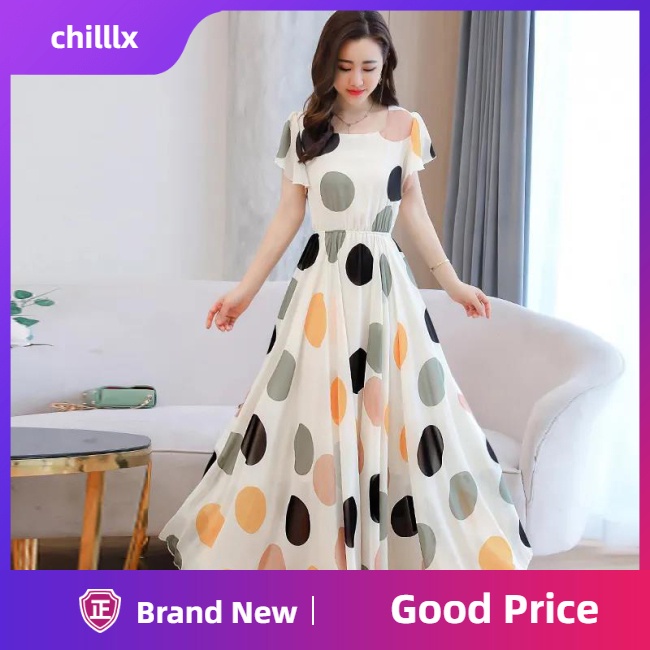 Đầm Chữ A Tay Loe Dài Cổ Tròn In Họa Tiết Chấm Bi Thời Trang Cho Nữ