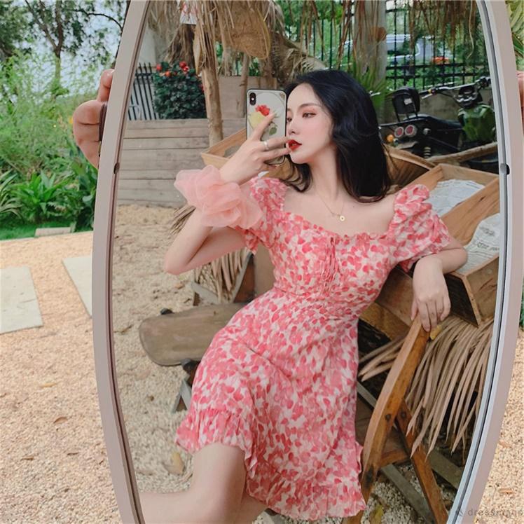 Đầm tay ngắn cổ chữ V họa tiết hoa phong cách retro thời trang mùa hè 2021 tùy chọn màu sắc