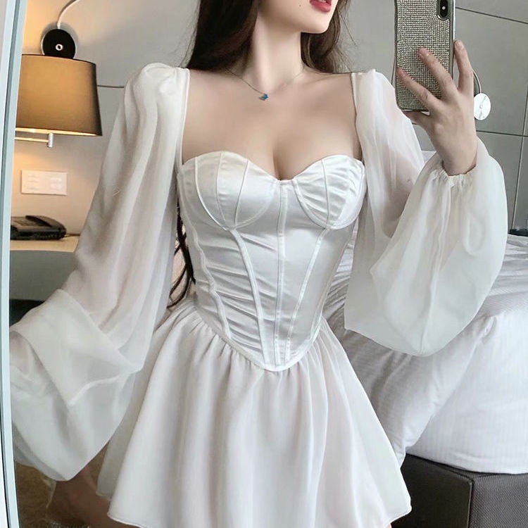ZY·HT Đầm Đuôi Cá Dáng Dài Cổ Vuông Tay Phồng Thời Trang Pháp Sang Trọng 6053