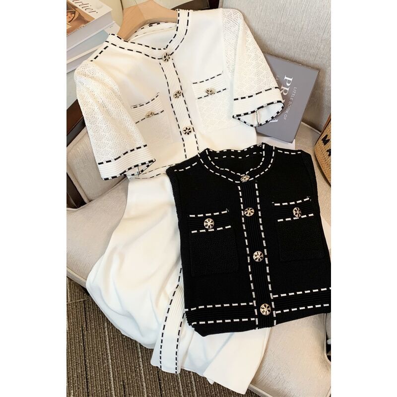 Đầm dáng chữ A lụa lạnh dệt kim ôm eo cổ tròn màu đen/ màu trắng phong cách Châu Âu thời trang mùa hè sang trọng mới