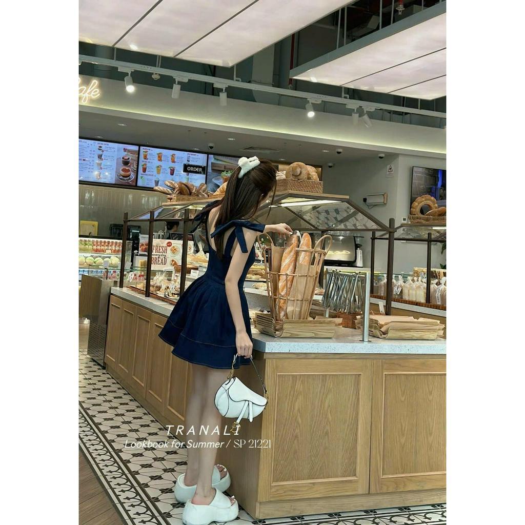 Đầm dự tiệc thời trang nữ sang chảnh chất jean cổ dây không tay cột nơ dáng váy xoè mini siêu xinh trẻ trung