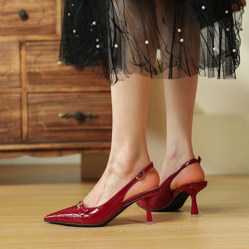 Đầm hở gót da thật màu đỏ rượu sang chảnh gót 7 phân kết hợp đồ đi tiệc hàng quảng châu có sẵn