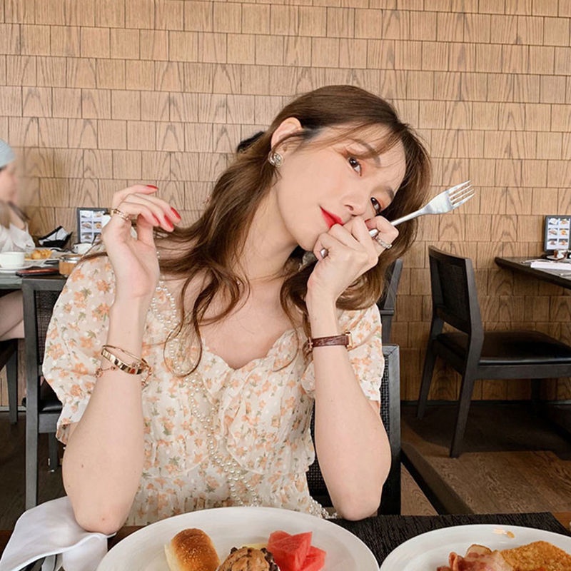 Váy Dài Tay Phồng Cổ Chữ V In Đầm Hoa Phong Cách Pháp Thời Trang Mới Cho Nữ