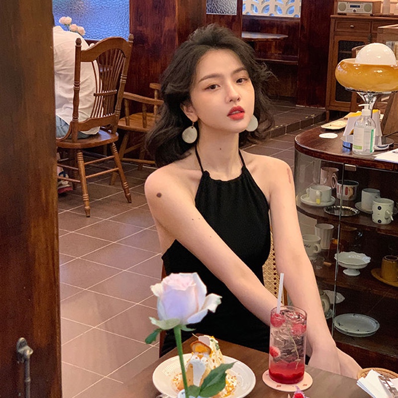 Đầm IELGY cổ yếm chiết eo phong cách Hồng Kông retro cho nữ