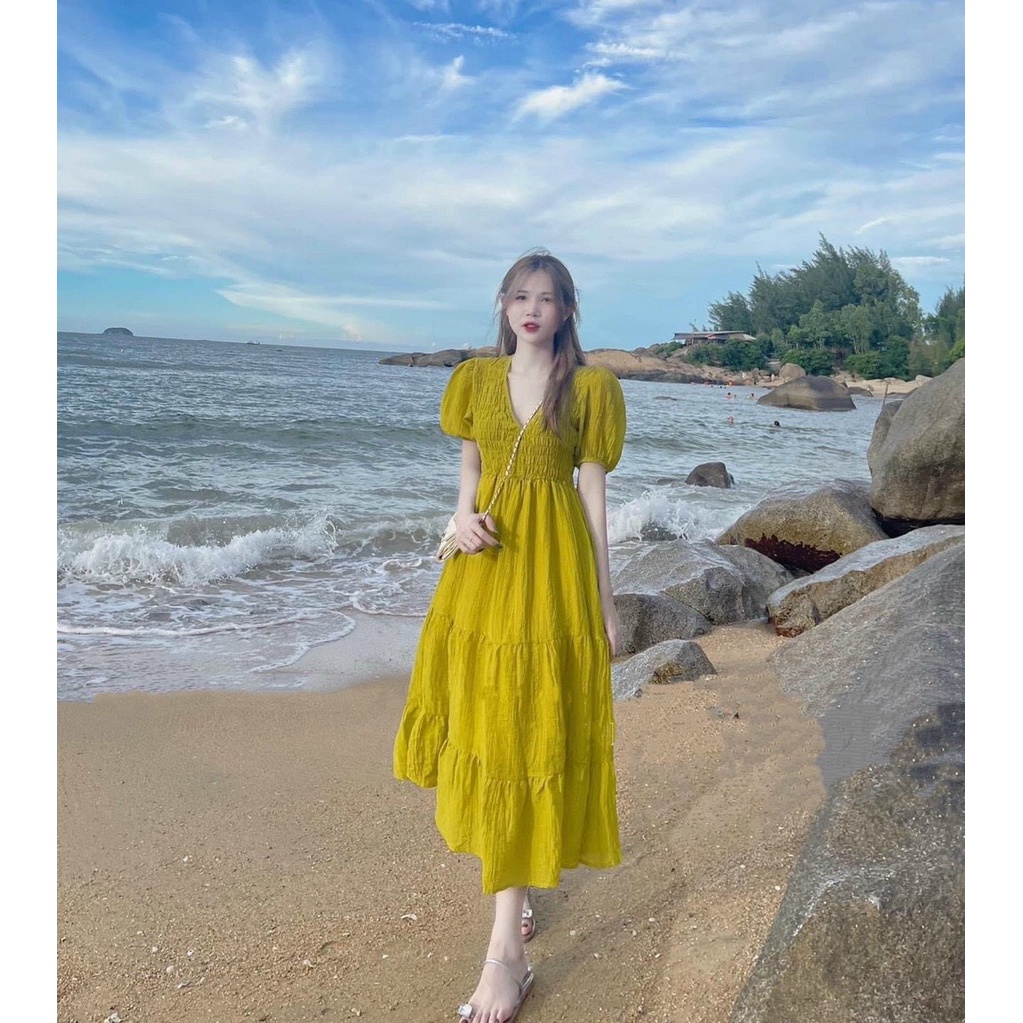 Váy Đầm Nữ Tơ Vàng Hồng Nơ Eo Cổ V Tay Lỡ Bồng Vai 2 Lớp Lót Lụa Voan Cao Cấp DH097