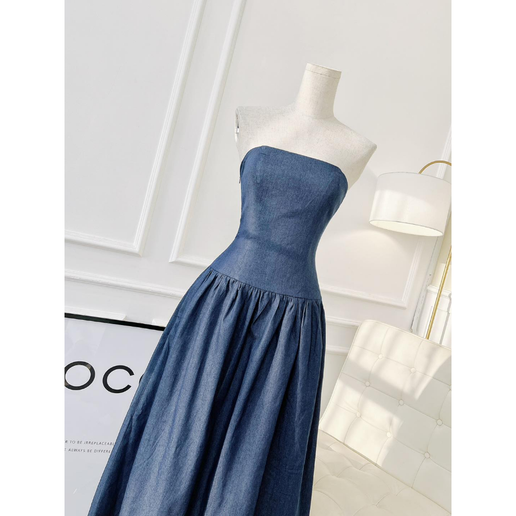 Đầm Maxi Cúp Ngực Chít Eo Tôn Dáng Nhún Thun Sau Chất Denim Đi Tiệc Sang Trọng