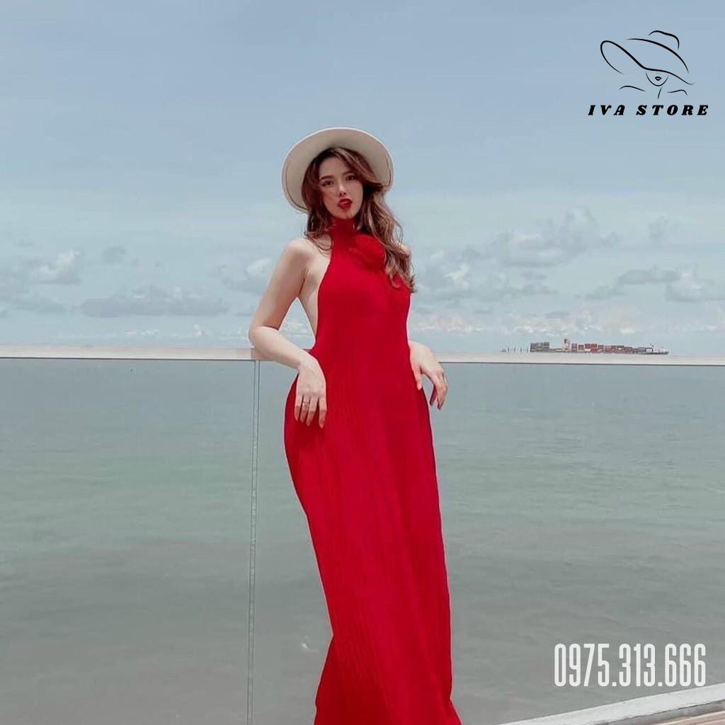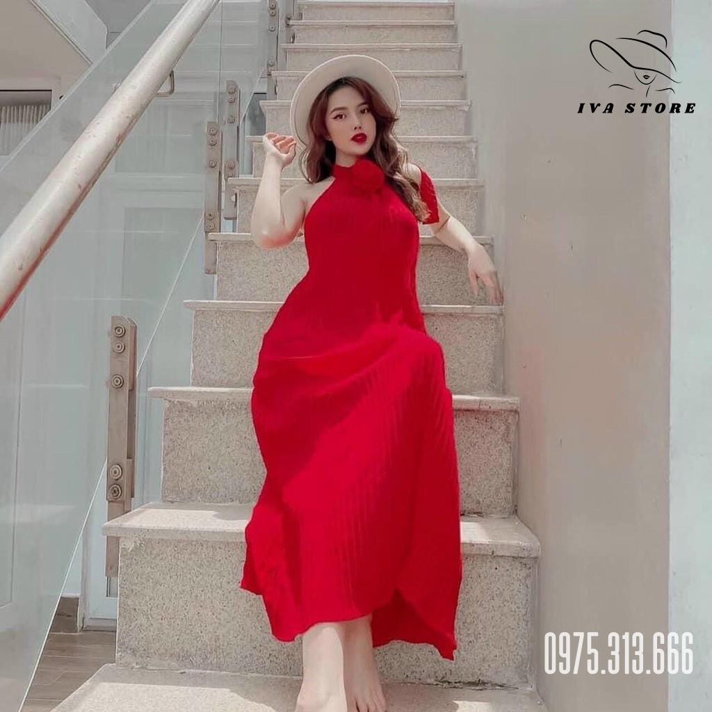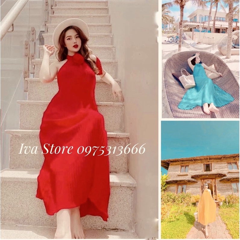 Đầm Maxi Cổ Yếm, Váy Maxi Dập Ly V54 Chất Voan Mềm Mướt, Mầu Đỏ, Xanh, Vàng, Cho Dáng Dài Miên Man Và Shot Ảnh Để Đời