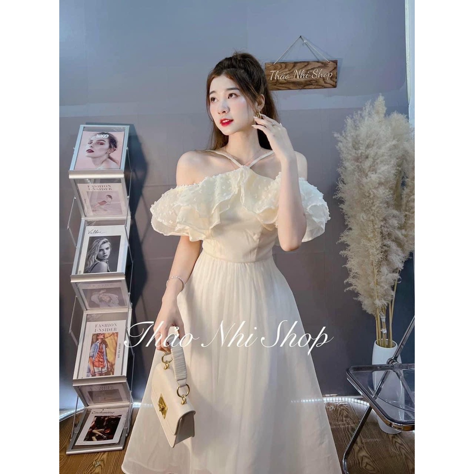 Đầm maxi yếm bánh bèo trễ vai chất tơ nhũ, váy maxi cổ yếm trễ vai bèo ngực màu be cao cấp, váy tơ bèo cổ yếm óng ánh
